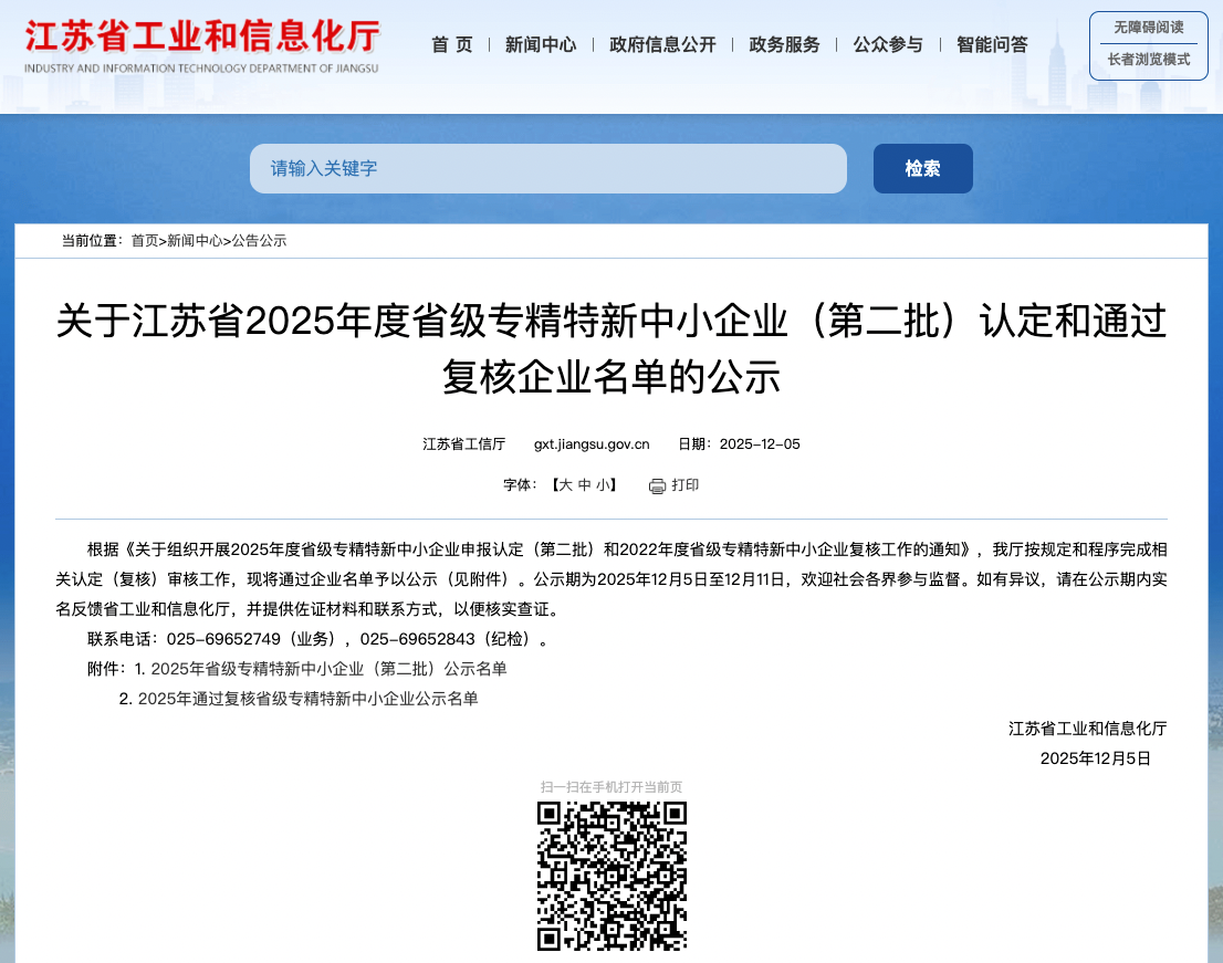 2025年12月5日,江苏省工业和信息化厅正式发布《2025年省级专精特新中小企业(第二批)公示名单》,南京万米信息技术有限公司(简称“万米商云”)凭借在技术创新领域的持续深耕与专业化市场的卓越表现,被认定为江苏省“专精特新”中小企业。